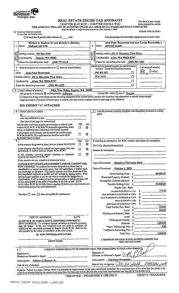 | 1 | 10/01/2020 | SWD | Statutory Warranty Deed | WILLIAM G BENBOW JR | ALAN P & ANN L BRAUNSTEIN | | | $65,000.00 | 135279 | |