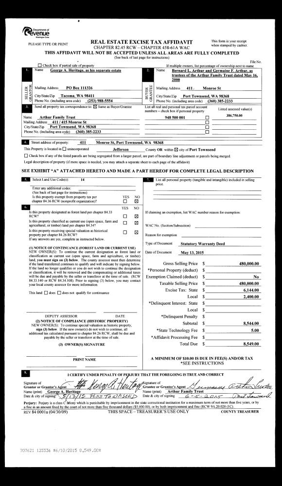| Mailing Address: | BERNARD L ARTHUR TRUSTEE GERMAINE F ARTHUR TRUSTEE 411 MONROE ST PORT TOWNSEND, WA 98368-5600 | % Ownership: | 100.0000000000% |