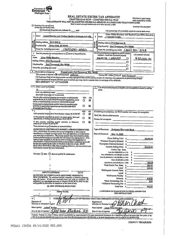 | 1 | 05/11/2020 | SWD | Statutory Warranty Deed | LELAND & LINDSEA BARLOW | LIAM P & RACHAEL A HENEBRY | | | $53,000.00 | 134336 | |