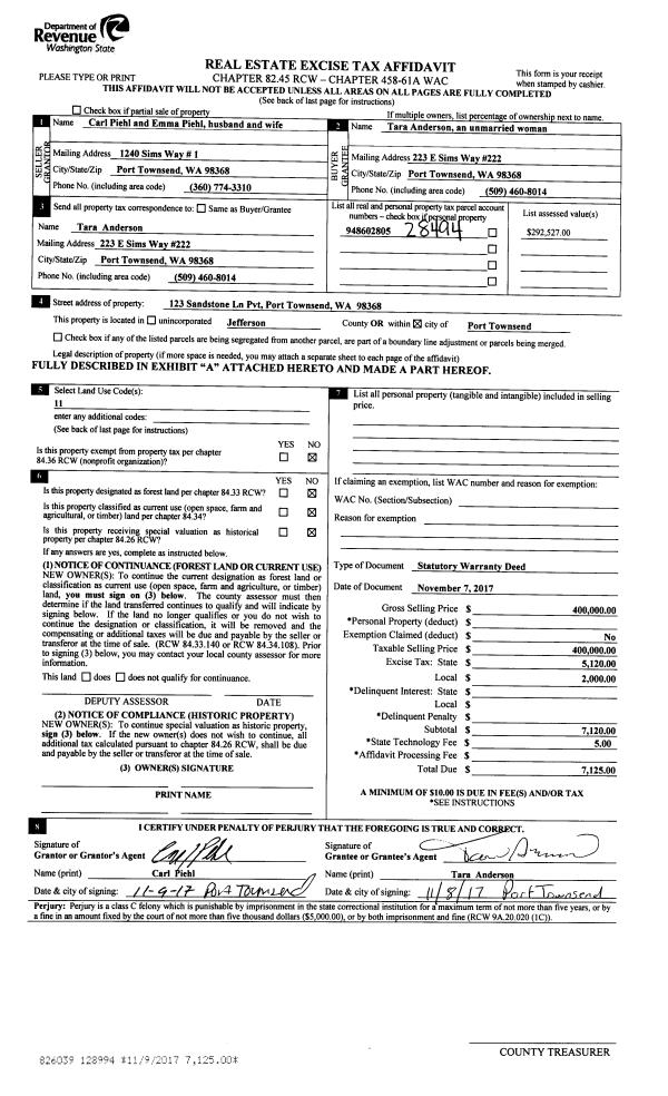 | 1 | 11/07/2017 | SWD | Statutory Warranty Deed | CARL PIEHL | TARA ANDERSON | | | $400,000.00 | 128994 | |