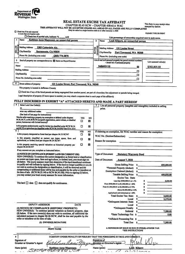 | 1 | 08/07/2020 | SWD | Statutory Warranty Deed | KATHLEEN ANNE MAGNUSON | LEAH R KILGORE | | | $455,000.00 | 134845 | |