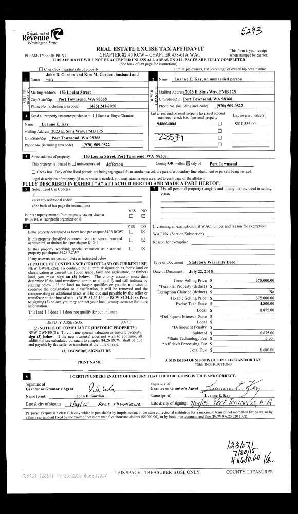 | 2 | 07/22/2015 | SWD | Statutory Warranty Deed | JOHN D GORDON JR | LUANNE E KAY | | | $375,000.00 | 123671 | |