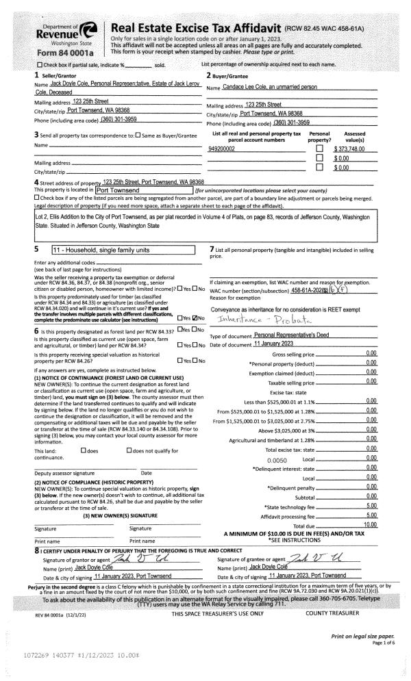 | 1 | 01/11/2023 | PRD | Personal Representatives Deed | JACK L COLE | CANDACE L COLE | | | | 140377 | |