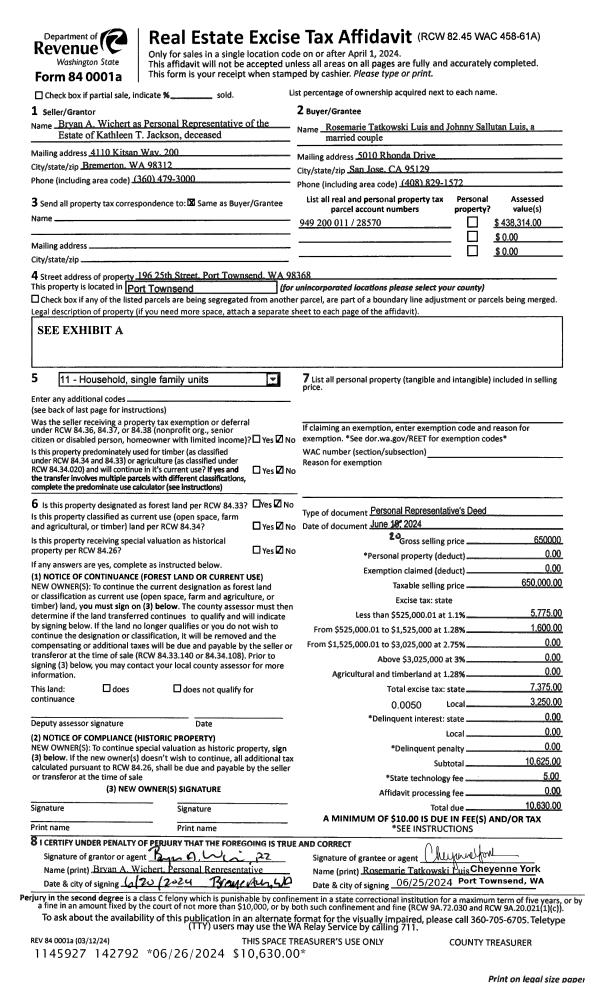 | 1 | 06/20/2024 | PRD | Personal Representatives Deed | KATHLEEN T JACKSON | ROSEMARIE T & JOHNNY S LUIS | | | $650,000.00 | 142792 | |