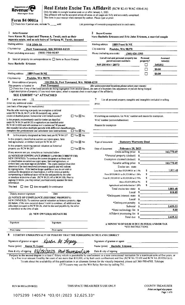 | 1 | 02/28/2023 | SWD | Statutory Warranty Deed | TORBJORG M TWEDT | RACHELLE & ERIC J ERICSSON | | | $163,770.00 | 140574 | |