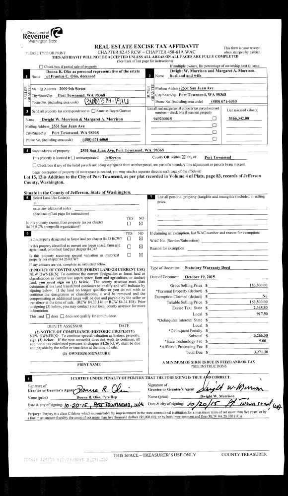 | 2 | 10/19/2015 | SWD | Statutory Warranty Deed | FRANKIE OLIN | DWIGHT W & MARGARET A MORRISON | | | $183,500.00 | 124215 | |