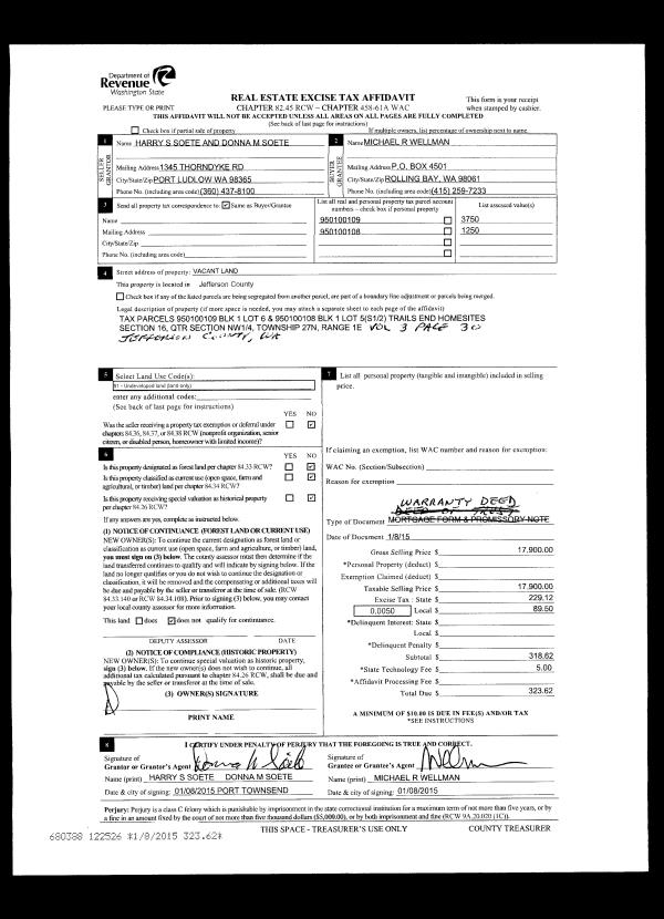 | 2 | 01/08/2015 | SWD | Statutory Warranty Deed | HARRY S SOETE | MICHAEL R WELLMAN | | | $17,900.00 | 122526 | |