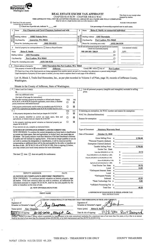 | 1 | 10/21/2020 | SWD | Statutory Warranty Deed | GUY CHAPMAN | HELEN E SMITH | | | $2,700.00 | 135436 | |