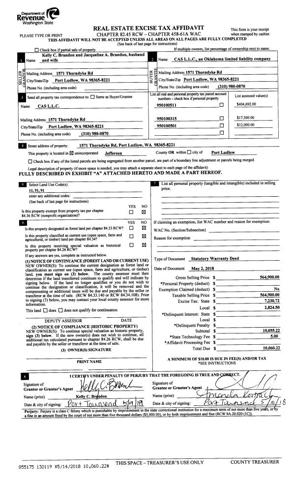 | 2 | 05/02/2018 | SWD | Statutory Warranty Deed | KELLY C BRANDON | CAS LLC | | | $564,900.00 | 130119 | |