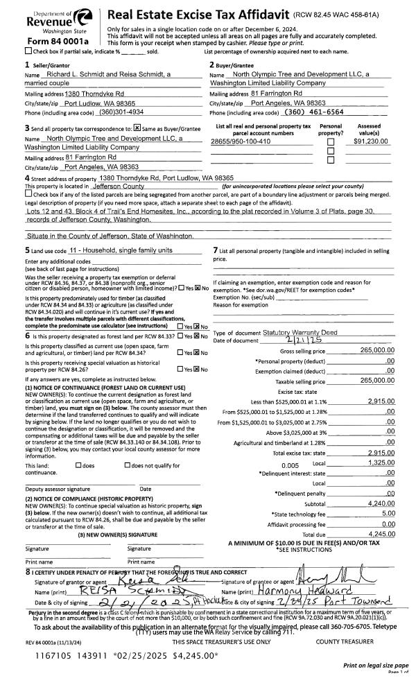 | 1 | 02/21/2025 | SWD | Statutory Warranty Deed | RICHARD L SCHMIDT | NORTH OLYMPIC TREE & DEVELOPMENT LLC | | | $265,000.00 | 143911 | |