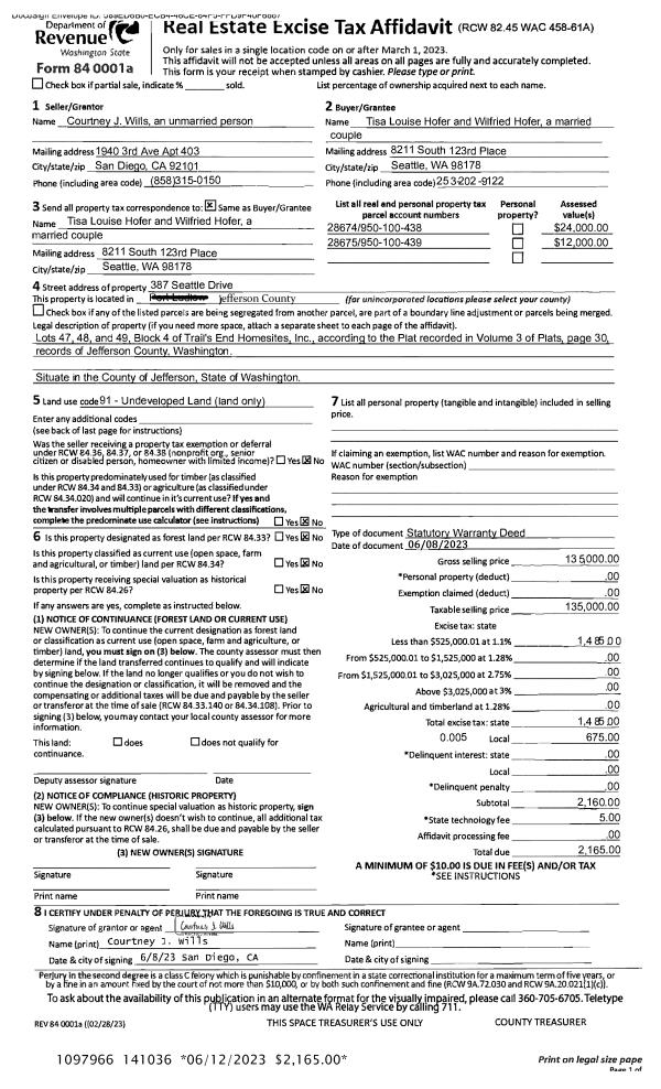 | 1 | 06/08/2023 | SWD | Statutory Warranty Deed | COURTNEY WILLS | TISA L & WILFRIED HOFER | | | $135,000.00 | 141036 | |
