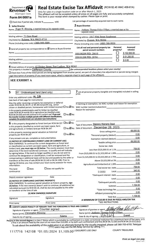 | 1 | 12/28/2023 | SWD | Statutory Warranty Deed | ROGER W BLESSING | ANTHONY T FELICE O'HARE | | | $69,000.00 | 142108 | |