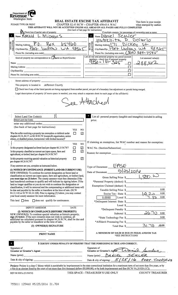 | 1 | 05/23/2016 | EASE | Assignment of Easement | RONALD L MICKENS | DANIEL W SEMLER | | | $1,500.00 | 125460 | |