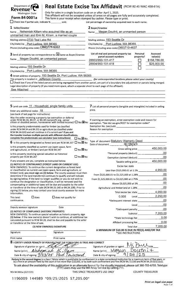 | 1 | 09/23/2025 | SWD | Statutory Warranty Deed | NEHEMIAH KILLAM | MEGAN DOUTHIT | | | $450,000.00 | 144989 | |