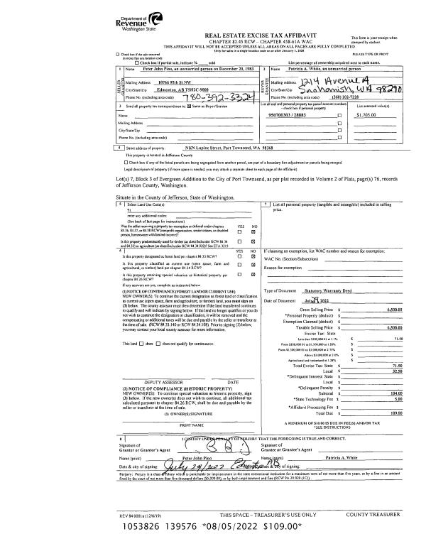 | 1 | 07/29/2022 | SWD | Statutory Warranty Deed | PETER JOHN PINO | PATRICIA L WHITE | | | $6,500.00 | 139576 | |