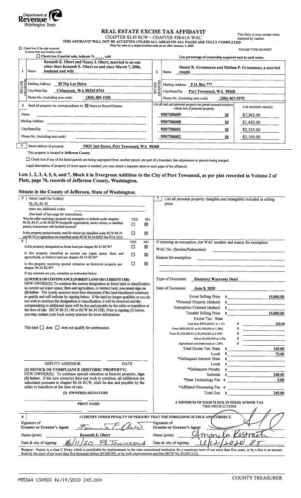 | 2 | 06/08/2020 | SWD | Statutory Warranty Deed | NANCY J OBERT | DANIEL R & MELISSA P GROUSSMAN | | | $15,000.00 | 134503 | |