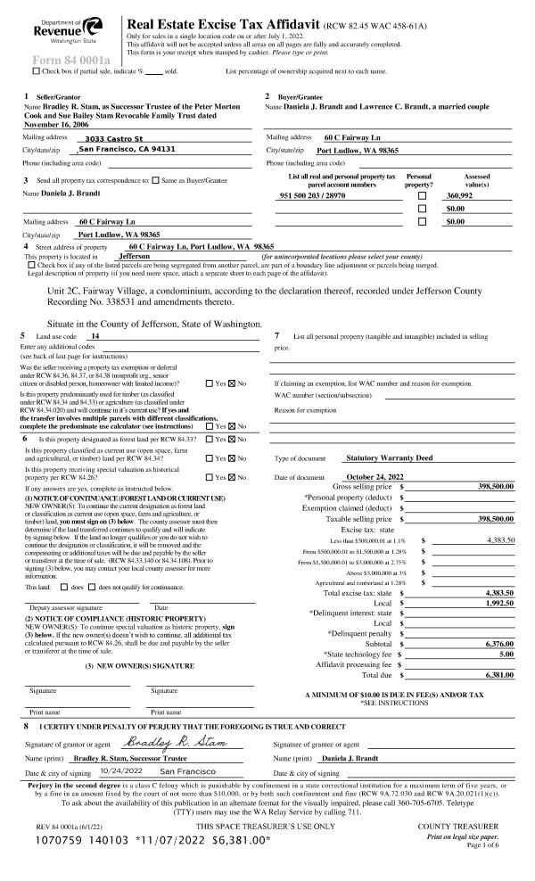 | 1 | 10/24/2022 | SWD | Statutory Warranty Deed | PETER M COOK TRUSTEE | LAWRENCE C & DANIELA J BRANDT | | | $398,500.00 | 140103 | |