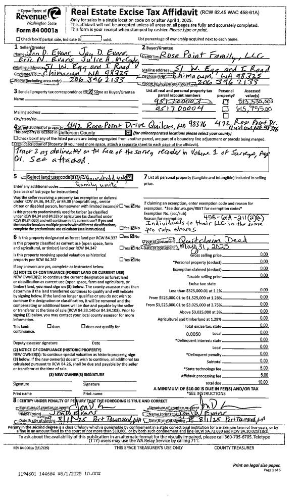 | 1 | 05/31/2025 | QCD | Quit Claim Deed | ERIC EVANS | ROSE POINT FAMILY LLC | | | | 144684 | |