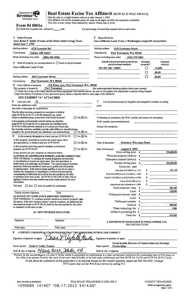 | 1 | 08/09/2023 | SWD | Statutory Warranty Deed | BRIAN P INFALT TRUSTEE | JEFFERSON LAND TRUST | | | $25,600.00 | 141407 | |
