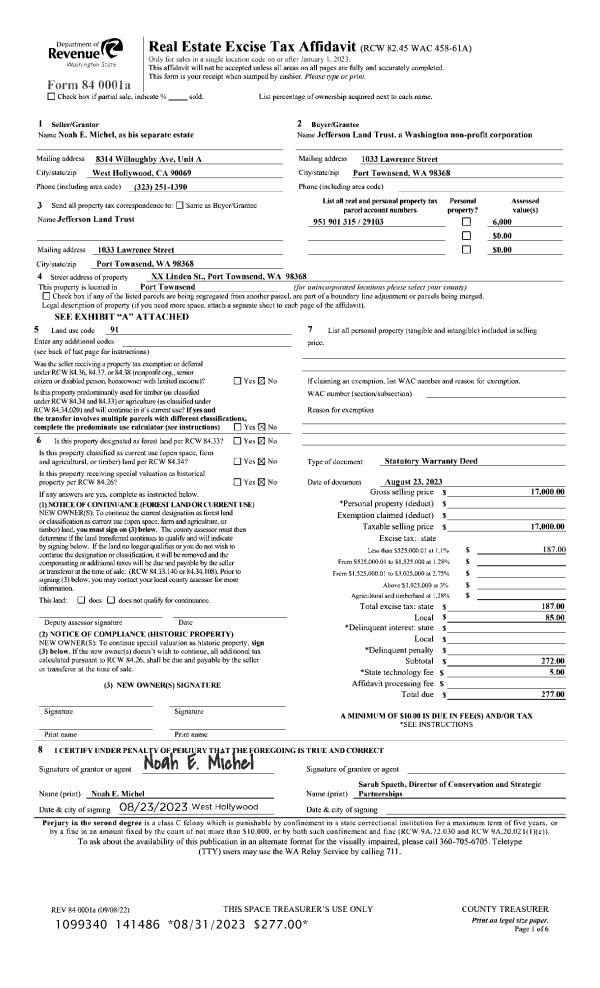 | 1 | 08/23/2023 | SWD | Statutory Warranty Deed | NOAH E MICHEL | JEFFERSON LAND TRUST | | | $17,000.00 | 141486 | |