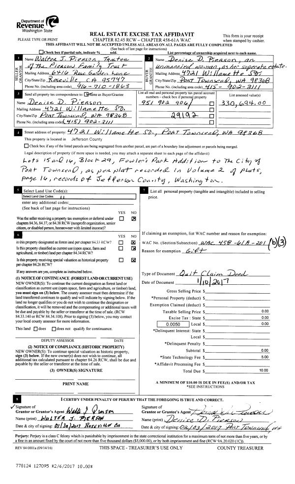 | Mailing Address: | 4721 WILLAMETTE ST PORT TOWNSEND, WA 98368 | % Ownership: | 100.0000000000% |