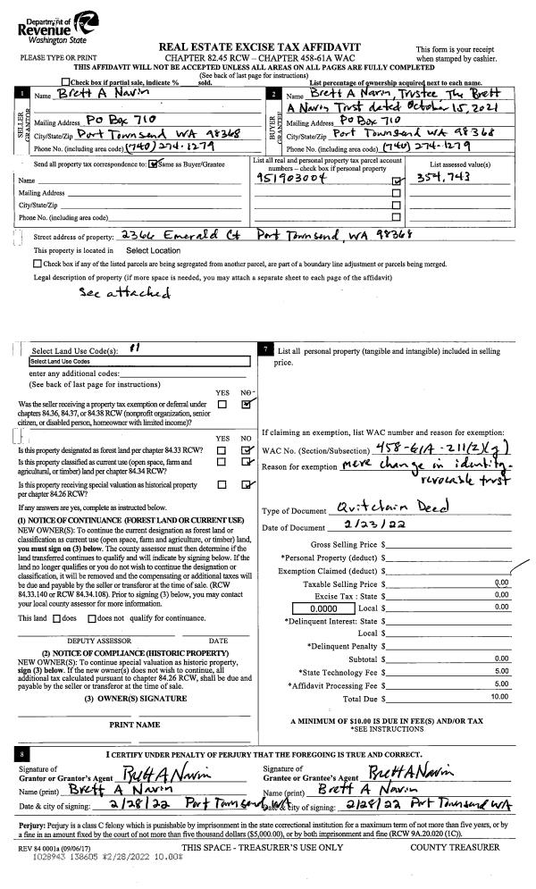 | 1 | 02/23/2022 | QCD | Quit Claim Deed | BRETT A NAVIN | BRETT A NAVIN TRUST | | | | 138605 | |