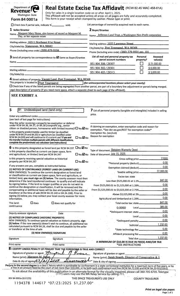 | 1 | 07/15/2025 | SWD | Statutory Warranty Deed | MARGARET M HESSE | JEFFERSON LAND TRUST | | | $77,000.00 | 144617 | |