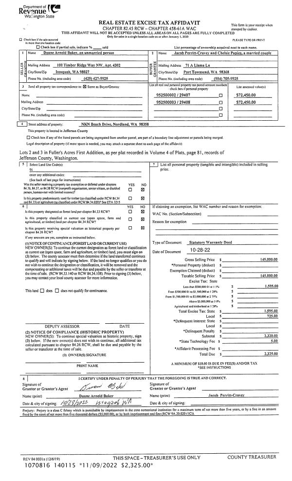 | 2 | 10/28/2022 | SWD | Statutory Warranty Deed | DUANE ARNOLD BAKER | JACOB PERRITT CRAVEY & CHELSIE PAPIEZ | | | $145,000.00 | 140115 | |