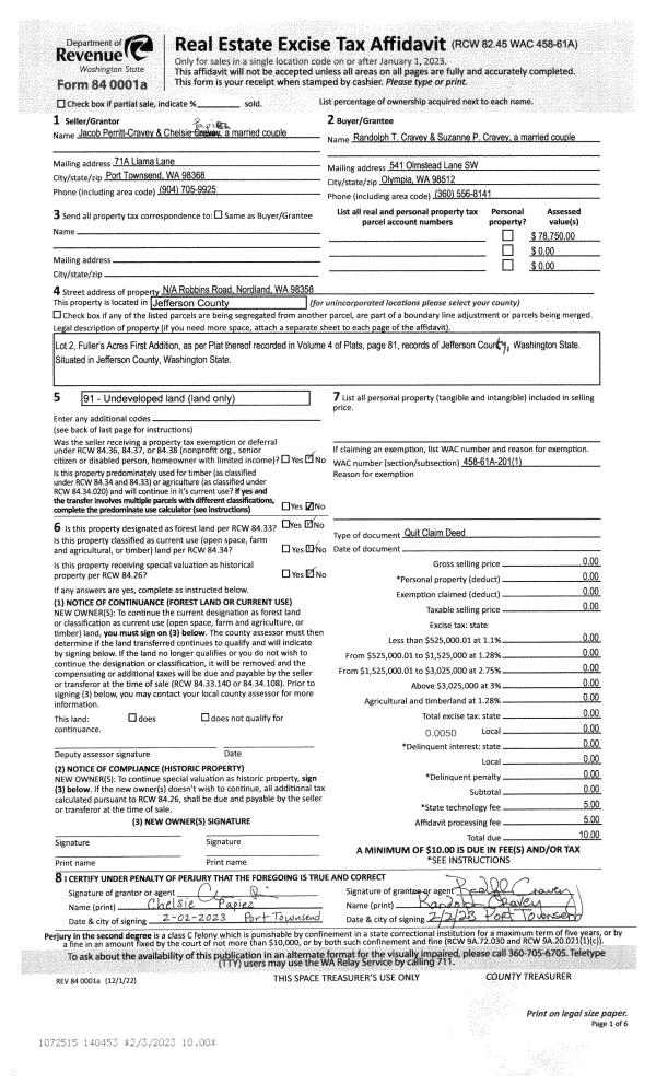 | 1 | 02/03/2023 | QCD | Quit Claim Deed | JACOB PERRITT CRAVEY & CHELSIE PAPIEZ | RANDOLPH T & SUZANNE P CRAVEY | | | | 140453 | |