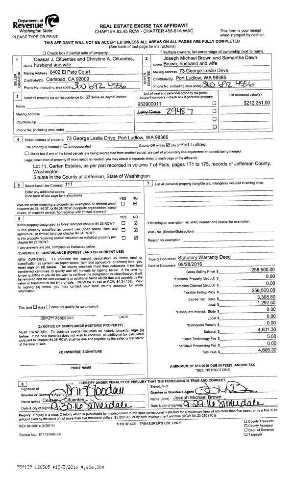 | 1 | 09/28/2016 | SWD | Statutory Warranty Deed | CEASAR J CIFUENTES | JOSEPH M & SAMANTHA D BROWN | | | $258,500.00 | 126365 | |