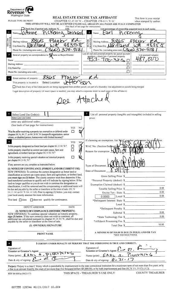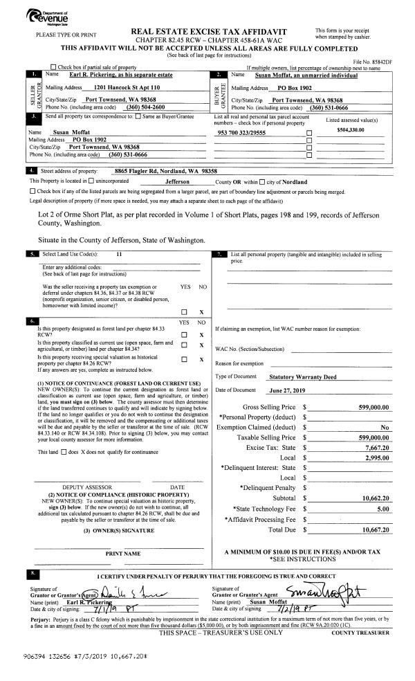 | 1 | 06/27/2019 | SWD | Statutory Warranty Deed | EARL R PICKERING | SUSAN MOFFAT | | | $599,000.00 | 132656 | |