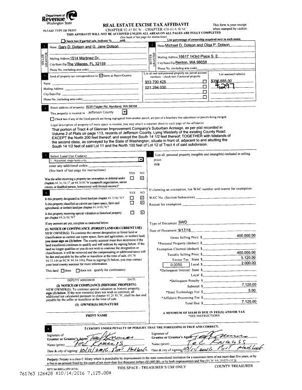 | 1 | 09/17/2016 | SWD | Statutory Warranty Deed | GARY D DOTSON | MICHAEL D & OLGA P DOTSON | | | $400,000.00 | 126428 | |