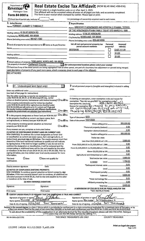 | 1 | 10/21/2025 | QCD | Quit Claim Deed | FORREST J & MARY C THIBEAULT | HEINZINGER PFANN FAMILY TRUST | | | $350,000.00 | 145208 | TO COMPLETE BLA RE-REC |