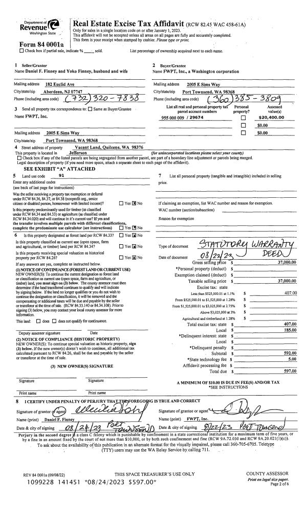 | 1 | 08/22/2023 | SWD | Statutory Warranty Deed | DANIEL F FINNEY | FWPT INC | | | $37,000.00 | 141451 | |