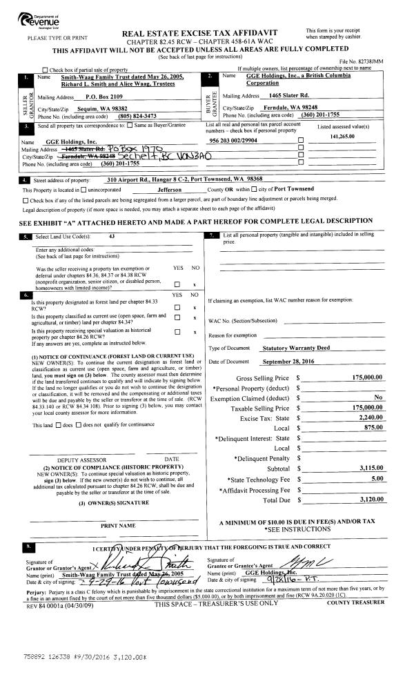 | 4 | 05/24/2009 | SWD | Statutory Warranty Deed | NW HANGARS LLC | SMITH-WAAG FAMILY TRUST | | | $190,000.00 | 112988 | 0 |