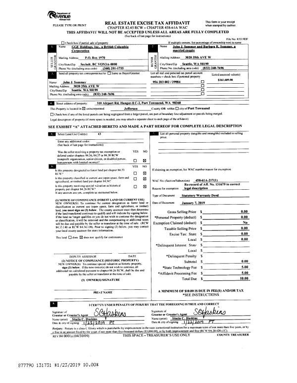 | 1 | 01/07/2019 | SWD | Statutory Warranty Deed | GGE HOLDINGS INC | JOHN J & BARBARA R SOMMER | | | $175,000.00 | 131679 | |
