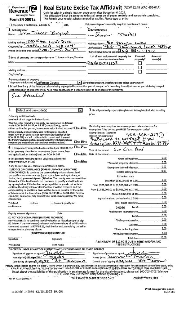 | 1 | 01/24/2025 | QCD | Quit Claim Deed | JOHN T BRIGHT | SUMMER MARTELL | | | | 143890 | RERECORD |