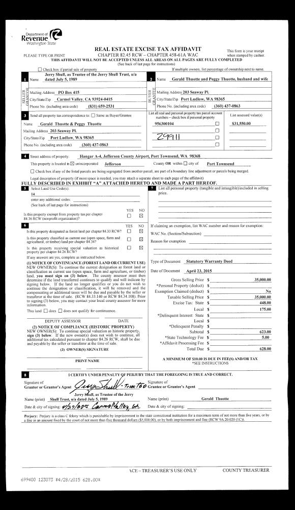 | Mailing Address: | GERALD THUOTTE TRUSTEE PEGGY THUOTTE TRUSTEE 203 SEAWAY PLACE PORT LUDLOW, WA 98365-8218 | % Ownership: | 100.0000000000% |