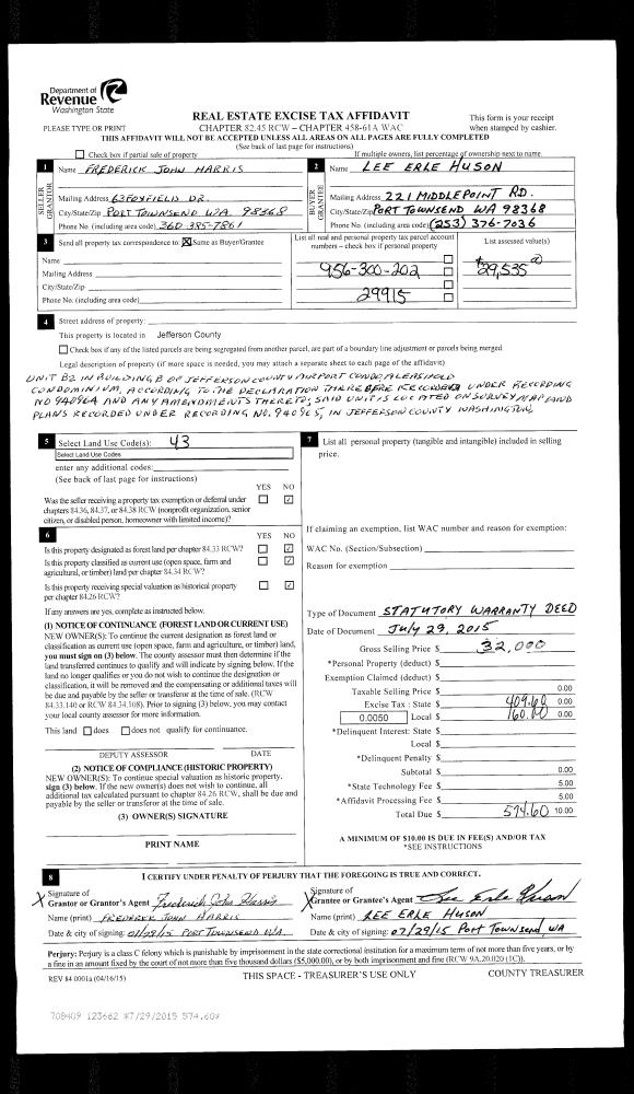 | 1 | 07/29/2015 | SWD | Statutory Warranty Deed | FRED J HARRIS | LEE ERLE HUSON | | | $32,000.00 | 123662 | |