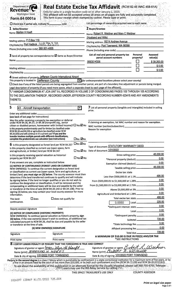 | 1 | 01/31/2022 | SWD | Statutory Warranty Deed | MARILYN H HOEFT | ROBERT R & MARY C WEIDNER | | | $45,000.00 | 138469 | |