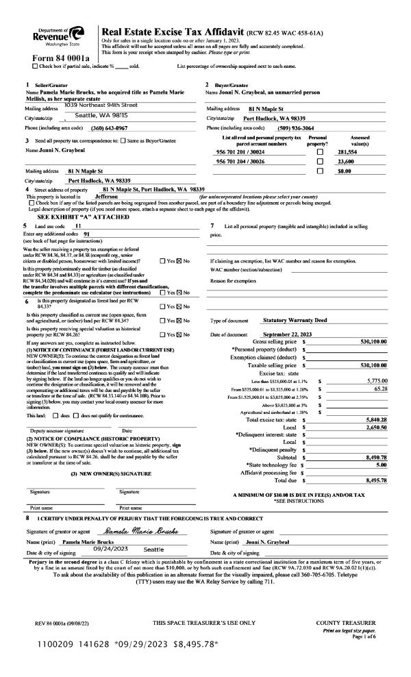 | 2 | 09/22/2023 | SWD | Statutory Warranty Deed | PAMELA MARIE MELLISH | JONNI GRAYBEAL | | | $530,100.00 | 141628 | |