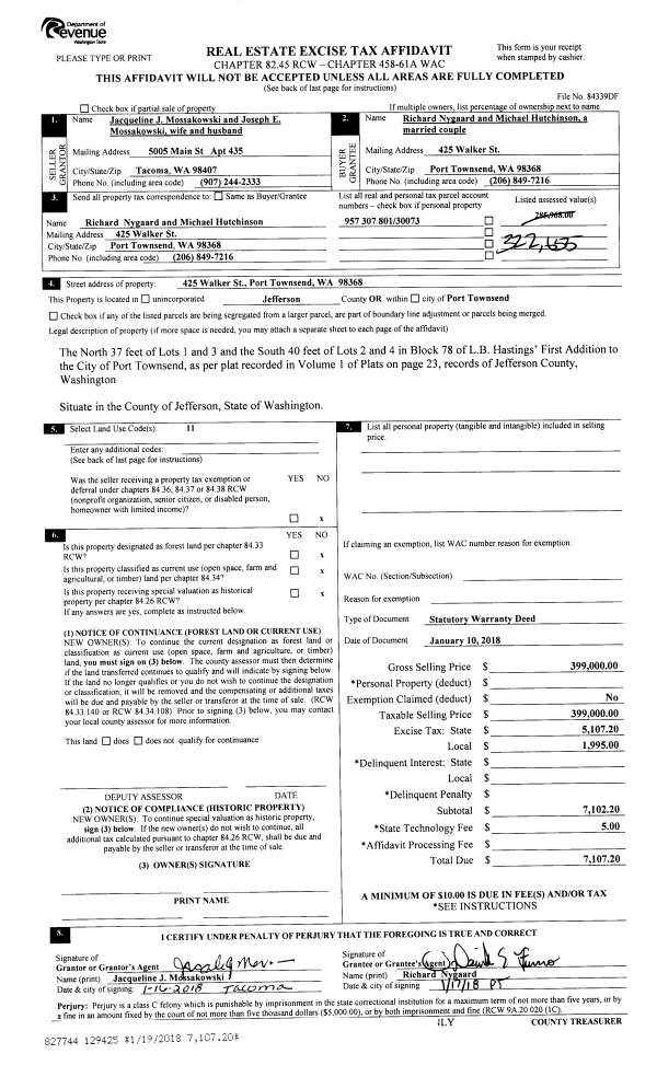 | 1 | 01/10/2018 | SWD | Statutory Warranty Deed | JACQUELINE J & JOSEPH E MOSSAKOWSKI | RICHARD NYGAARD & MICHAEL HUTCHINSON | | | $399,000.00 | 129425 | |