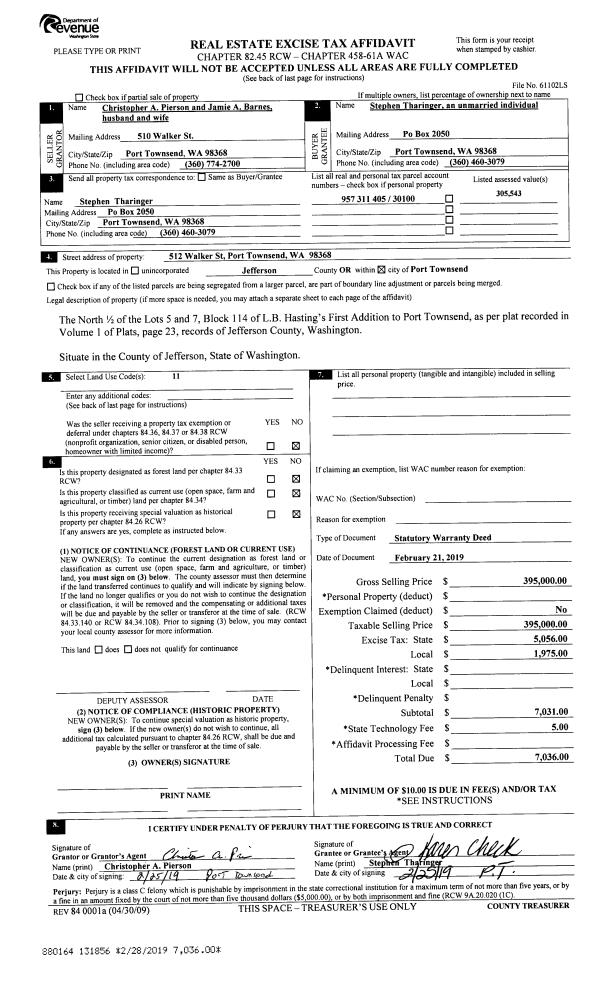 | 1 | 02/21/2019 | SWD | Statutory Warranty Deed | CHRISTOPHER PIERSON & JAMIE BARNES | STEPHEN THARINGER | | | $395,000.00 | 131856 | |