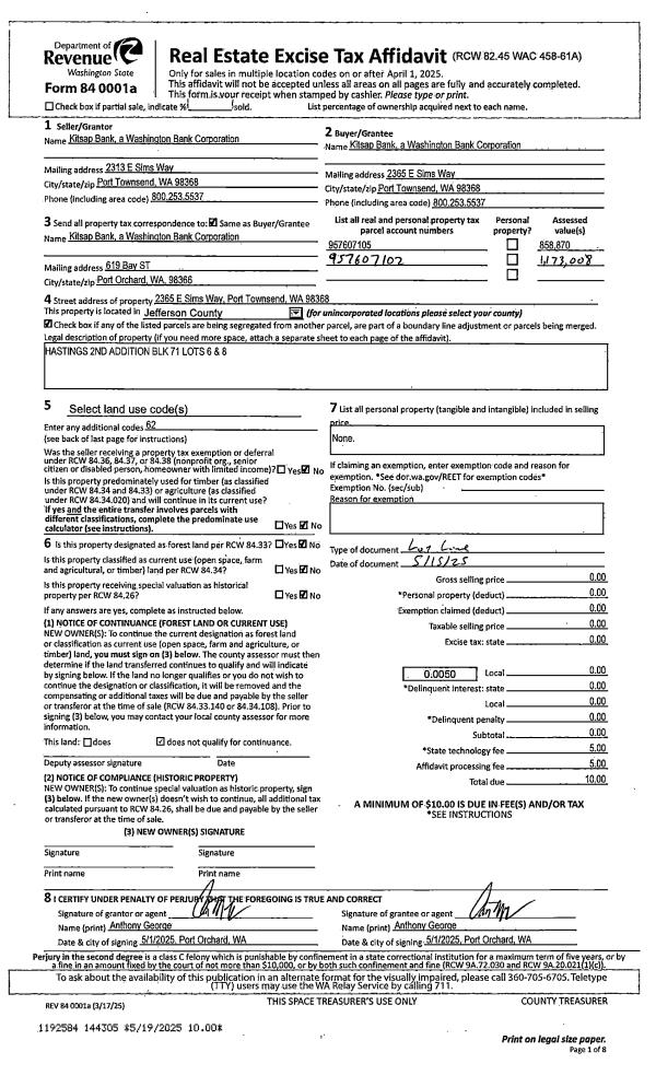| 1 | 07/28/2025 | SWD | Statutory Warranty Deed | KITSAP BANK | TAPT LLC | | | $910,000.00 | 144693 | |