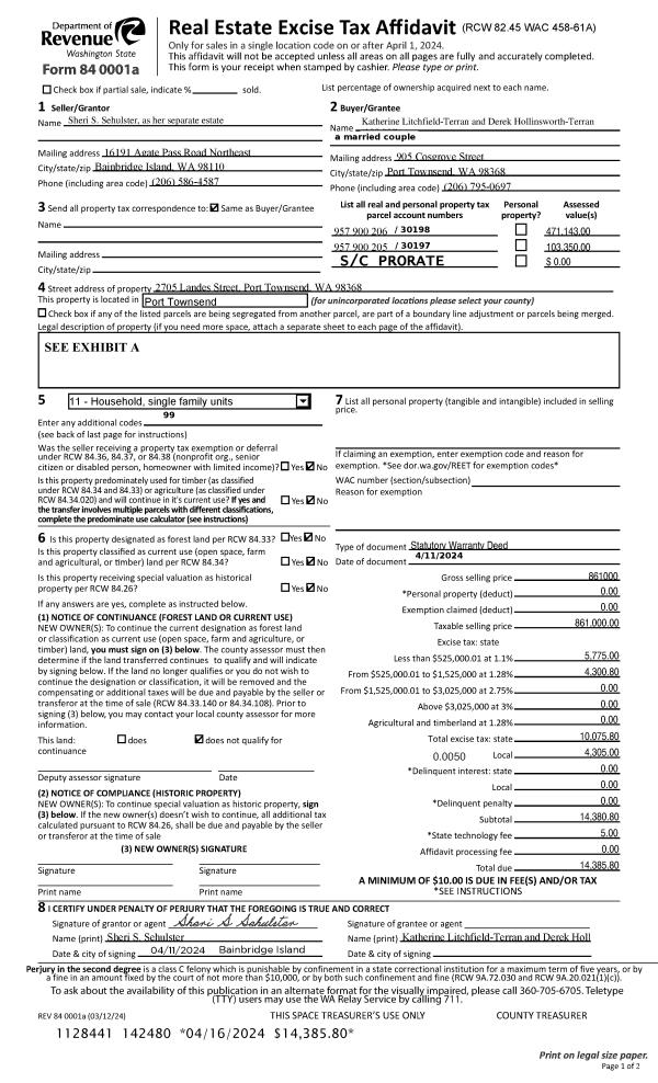 | 1 | 04/11/2024 | SWD | Statutory Warranty Deed | SHERI S SEHULSTER | KATHERINE LITCHFIELD-TERRAN | | | $861,000.00 | 142480 | |