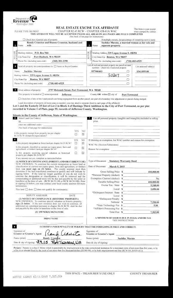 | 1 | 03/05/2015 | SWD | Statutory Warranty Deed | RANDY CRANSTON | SACHIKO MURATA | | | $410,000.00 | 122815 | |