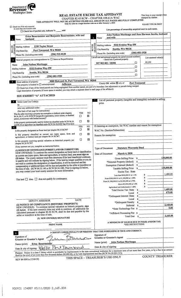 | 5 | 03/19/2019 | MISC | MISC | ERICA BAUERMEISTER AND BENJAMIN BAUERMEISTER | CITY OF PORT TOWNSEND | | | | 0 | 623112 |