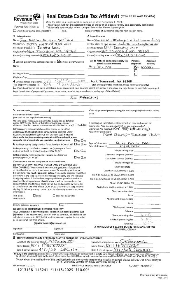 | 1 | 10/14/2024 | QCD | Quit Claim Deed | JOHN N MORITSUGU & JANE H JACOBS | HARMON JACOBS MORITSUGU FAM REV TRUST | | | | 145241 | |