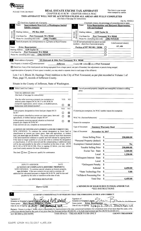| 5 | 03/19/2019 | MISC | MISC | ERICA BAUERMEISTER AND BENJAMIN BAUERMEISTER | CITY OF PORT TOWNSEND | | | | 0 | 623112 |