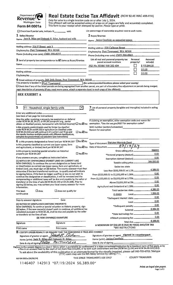 | 1 | 07/17/2024 | SWD | Statutory Warranty Deed | JACK R BILAN | JANICE CAMFIELD | | | $399,000.00 | 142913 | |
